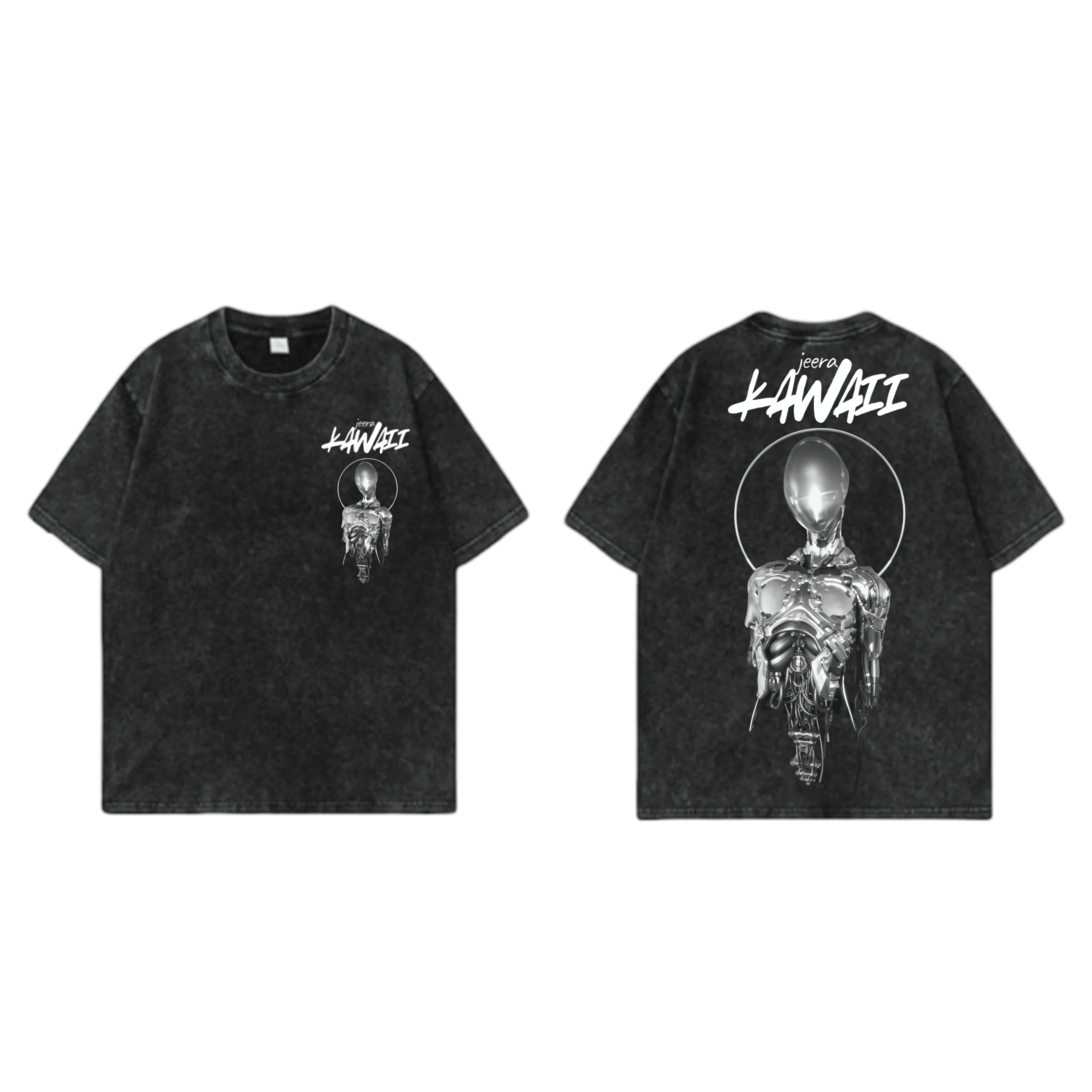 ด้านหลัง (Back Detail): หุ่นยนต์โครเมียมใหญ่พิมพ์ลายชัดเจนโดดเด่น พร้อมข้อความ “jeera KAWAII” ด้านบน เป็นจุดโฟกัสที่แสดงถึงความมั่นใจและไม่เหมือนใคร