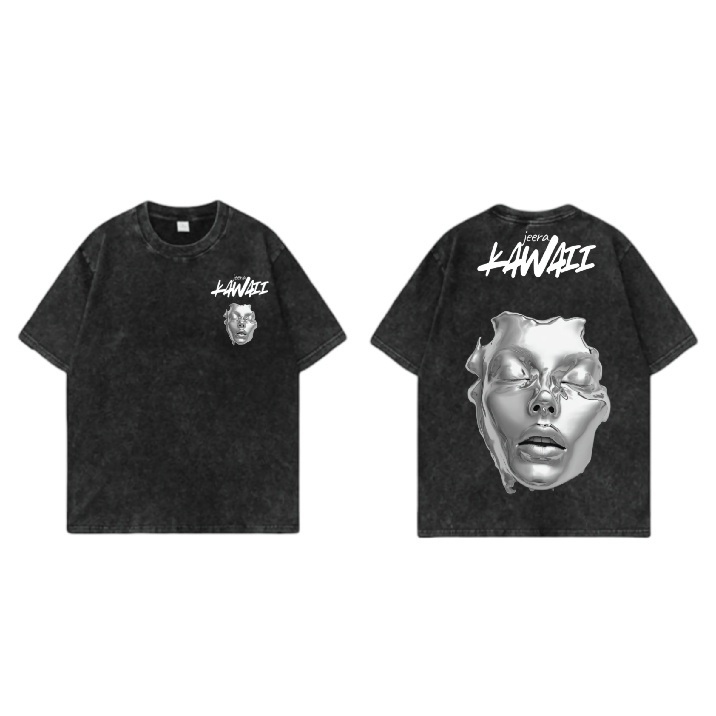 เสื้อยืด “jeera KAWAII” ดีไซน์สุดโดดเด่น ที่ผสมผสานความเท่ของสตรีทแฟชั่นเข้ากับความวินเทจอย่างลงตัว ด้วยเทคนิคการฟอกสีแบบ Stone Washed ทำให้เนื้อผ้ามีสีดำหม่น/เทาเข้ม มีมิติ และสัมผัสที่นุ่มสบายเหมือนใส่มานานแล้ว