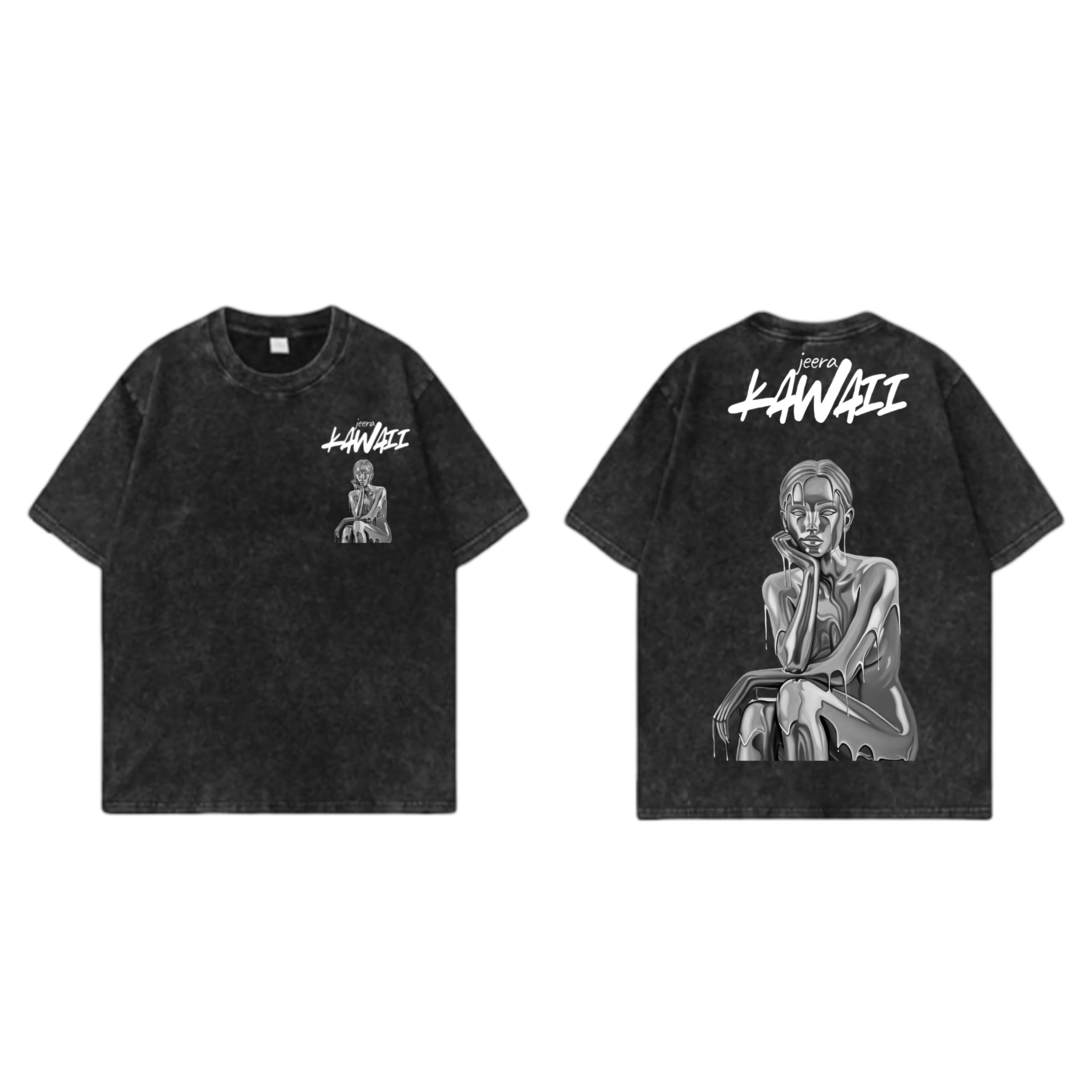 เสื้อยืด “jeera KAWAII” ดีไซน์สุดโดดเด่น ที่ผสมผสานความเท่ของสตรีทแฟชั่นเข้ากับความวินเทจอย่างลงตัว ด้วยเทคนิคการฟอกสีแบบ Stone Washed ทำให้เนื้อผ้ามีสีดำหม่น/เทาเข้ม มีมิติ และสัมผัสที่นุ่มสบายเหมือนใส่มานานแล้ว