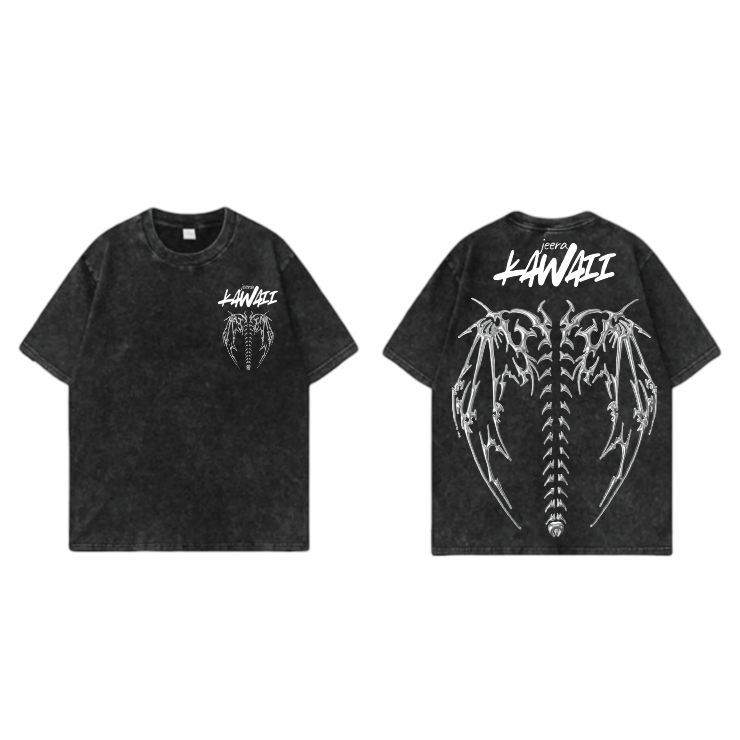 ด้านหลัง (Back Detail): กระดูกปีกมังกรขนาดใหญ่พิมพ์ลายชัดเจนโดดเด่น พร้อมข้อความ “jeera KAWAII” ด้านบน เป็นจุดโฟกัสที่แสดงถึงความมั่นใจและไม่เหมือนใคร